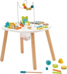 Op het tafelblad ontdekken kinderen diverse stations: een draadkralenlabyrint, xylofoon met stokje, draaibare tandwielen, magnetisch visspel, vormenstoof en andere slimme elementen om logica, geduld en coördinatie te trainen. Dankzij meerdere activiteiten op één plek blijft de speelhoek overzichtelijk en kunnen kinderen zich gemakkelijk concentreren.