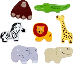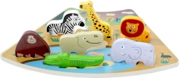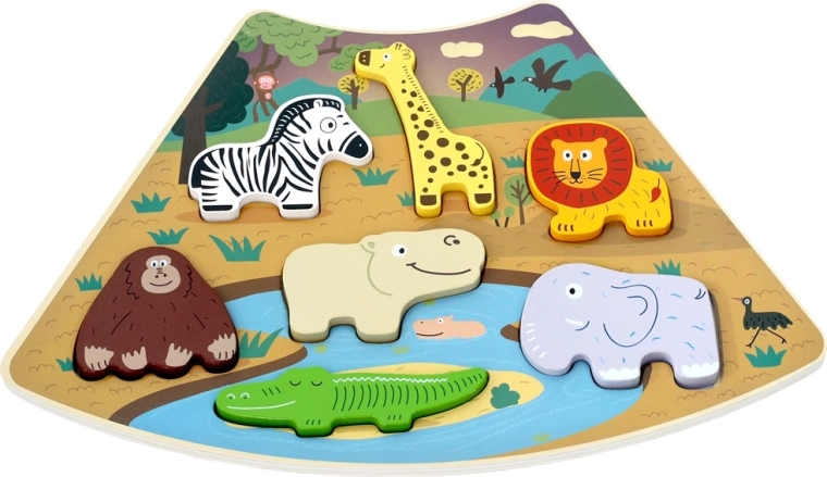 De houten puzzel Safari is het ideale speelgoed voor de eerste puzzelervaringen. De kleurrijke en schattige dierenfiguren – zebra, giraffe, leeuw, gorilla/orang-oetan, nijlpaard, olifant en krokodil – hebben dikke, gemakkelijk vast te pakken vormen die het hanteren voor kinderen vergemakkelijken. De onderplaat met savannelandschap helpt bij het ruimtelijk inzicht en het herkennen van vormen, omdat elk stukje zijn precies passende plek heeft.