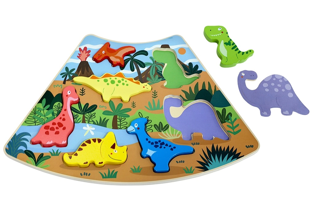Deze houten inlegpuzzel met dinosaurussen is ideaal voor de eerste puzzelervaringen. De dikke, gladde stukjes zijn makkelijk vast te pakken; kinderen leggen ze in de bijpassende vormen en trainen zo de oog-handcoördinatie. Dankzij de heldere kleuren en schattige illustraties leren kinderen op een natuurlijke manier kleuren en vormen te onderscheiden.