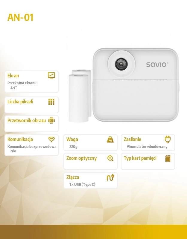 Ontdek het plezier van fotograferen met de instantkindercamera SAVIO AN‑101. Dankzij directe zwart‑wit afdrukken zonder inkt, een 48 MP sensor, een 2,4" kleurendisplay en selfiestand leggen kinderen hun belevenissen moeiteloos vast en delen ze die meteen. Ingebouwde spelletjes, een 1200 mAh‑batterij tot 6 uur en opladen via USB‑C maken de AN‑101 tot de perfecte metgezel voor thuis, op vakantie en bij familieactiviteiten.
