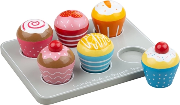 Zes vrolijke houten muffins op een dienblad voor spel in de kinderkeuken, winkel of theekransje. Elke muffin is kleurrijk versierd, past gemakkelijk in de houten standaard en stimuleert de verbeelding, fijne motoriek en sociale vaardigheden. Gemaakt van hoogwaardig, verantwoord gewonnen hout en in overeenstemming met de huidige Europese veiligheidsnormen.