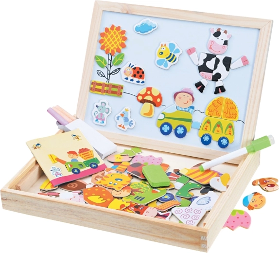 Ontdek de charme van het platteland met een creatieve set voor kleine makers! Dit dubbelzijdige magnetische bord biedt schrijven met stift op de witte zijde en tekenen met krijt op de leisteenzijde. Kinderen kunnen gekleurde magneetjes met boerderijmotieven vastklikken, verhaaltjes maken, vormen en kleuren leren en zowel fijne motoriek als fantasie ontwikkelen. Alles is opgeborgen in een praktische houten box voor gemakkelijk meenemen.