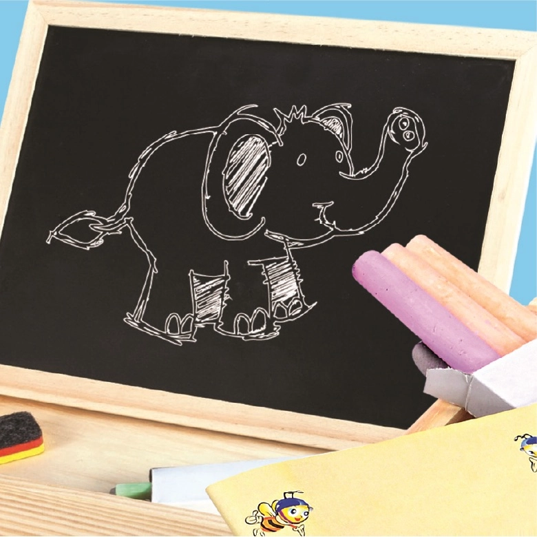 dubbelzijdig bord in houten box, 3 krijtjes, stift met vilten spons, magneetjes, voorbeeldkaart