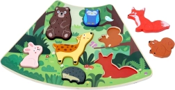 Stevige houten stukjes en precies passende uitsparingen leren kinderen de juiste greep, oog-handcoördinatie en het herkennen van vormen en dieren.