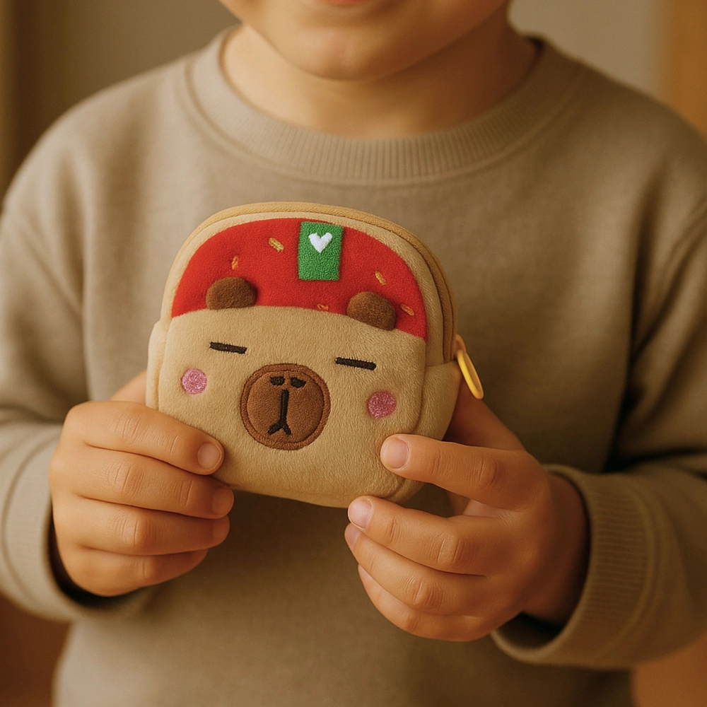 Deze zachte pluchen portemonnee met capibara-motief en een rode aardbeimuts betovert met zijn schattige design en aangename materiaal. Dankzij de rits blijven je spulletjes veilig en met de clip heb je de portemonnee altijd bij de hand – aan je rugzak, tas of broeklus.