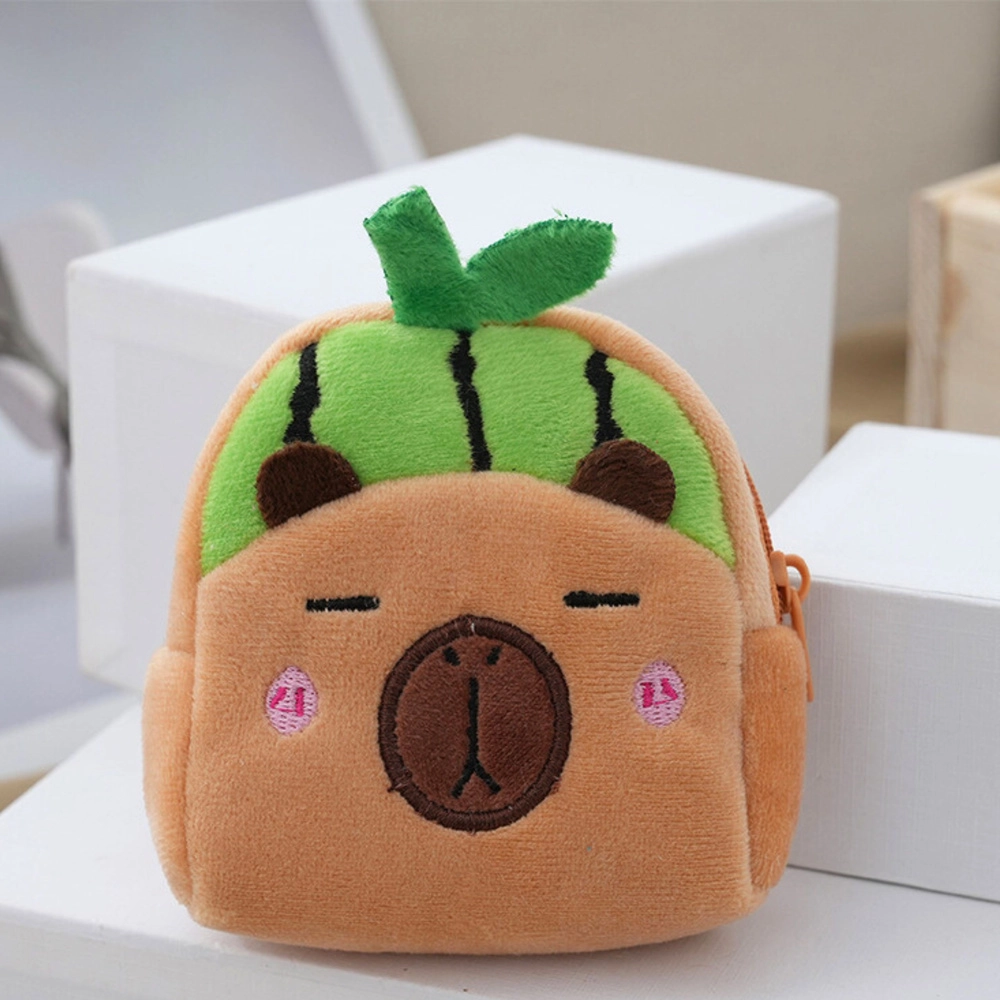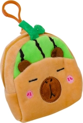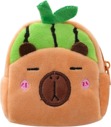 Schattige en praktische miniportemonnee in de vorm van een capibara met een motief van een groene watermeloen. Dankzij de zachte pluche voelt hij prettig aan, heeft een ritssluiting voor het veilig opbergen van kleinigheden en een plastic clip om aan een rugzak of sleutels te bevestigen. De compacte afmetingen van 9,5 × 8 cm passen in je broekzak, tas of schoolrugzak.