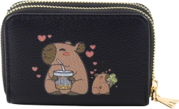 Stijlvolle zwarte portemonnee met een schattig capibara-motief biedt compacte afmetingen en tegelijk een grote capaciteit. Twee gescheiden ritsvakken en interne accordeonvakken ordenen kaarten, bankbiljetten en munten overzichtelijk. Duurzaam materiaal met leertextuur en praktische afmetingen voor dagelijks gebruik in handtas, rugzak of heuptas.