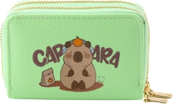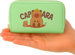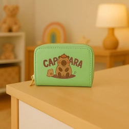 Compacte groene portemonnee met een schattig capibara-motief, voorzien van twee aparte ritsvakken en een harmonica-achtige binnenindeling voor overzichtelijke opslag van kaarten, briefgeld en muntjes. Duurzaam materiaal met leertextuur, gouden ritsen en praktische afmetingen maken het een ideale accessoire voor kinderen, tieners en volwassenen.