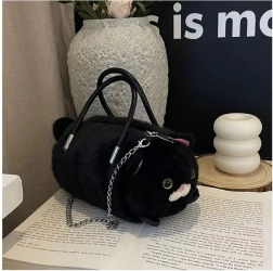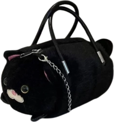 Schattige pluchen handtas in de vorm van een kat in elegant zwart, die stijl en functionaliteit combineert. De zachte, knuffelige afwerking, opvallende kattendetails en praktische dubbele handvatten worden aangevuld met een afneembare metalen ketting voor over de schouder. Ritssluiting beschermt je essentials; de compacte afmetingen zijn ideaal voor elke dag en ook als een lief cadeautje.
