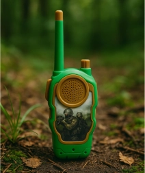 De set van twee walkietalkies in military design is ideaal voor kleine ontdekkers. Druk gewoon op de knop en praat – zo eenvoudig! Kinderen genieten van duidelijke communicatie tijdens spelletjes in de tuin, op de speelplaats en thuis. De compacte afmetingen liggen perfect in kinderhanden en het lage gewicht maakt dragen tijdens elk avontuur gemakkelijk.