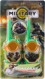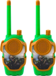 Een leuke set van twee kinderwalkietalkies in militaire stijl zorgt voor uren actie binnen en buiten. Eenvoudige bediening met de PTT-knop, licht en compact design voor kinderhanden en een bereik van ongeveer 10 m ondersteunen teamwork, communicatie en avontuurlijke missies. De robuuste kunststof behuizing in groen-oranje en de realistische look nodigen uit tot creatief soldaatje spelen.