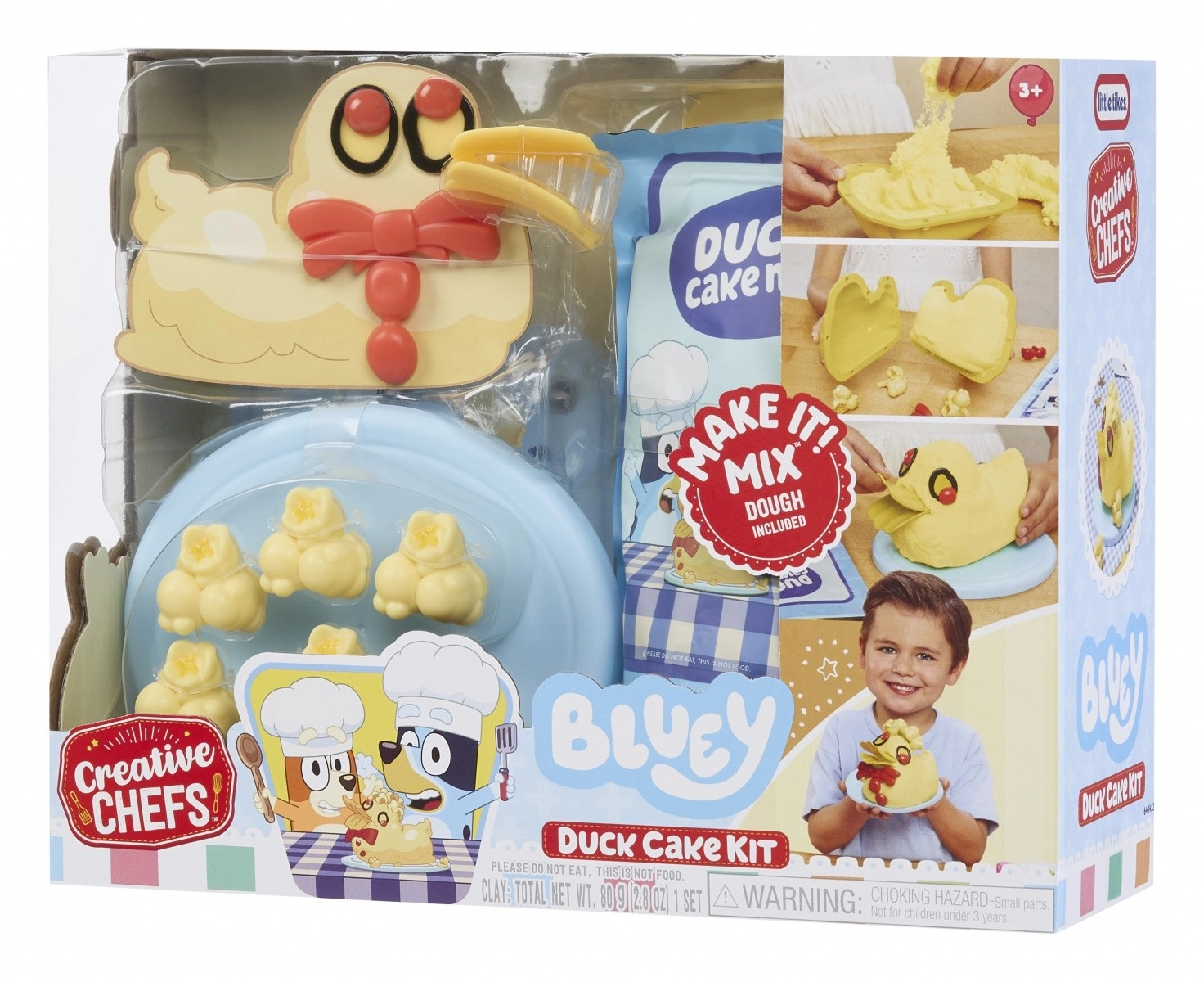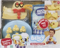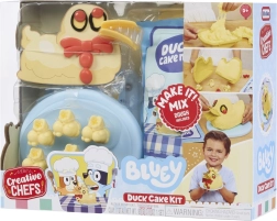 De set CREATIVE CHEFS BLUEY – Taart “Eendje” biedt kinderen uren speelplezier en stimuleert hun verbeelding. Bevat 15 realistische keukentools, een eendvorm en kneedmassa Make It! Mix. Inclusief een stapsgewijs beeldrecept dat kinderen leert eenvoudige instructies te volgen en creatief spel en rollenspel ondersteunt.