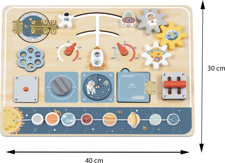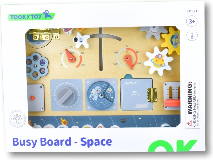 Ga op ruimtemissie met het interactieve houten bord van Tooky Toy, dat Montessori-principes combineert met creatief spel. De kleurrijke motieven van planeten, raketten en astronauten en de vele manipulatieve elementen ontwikkelen de fijne motoriek, logica en verbeelding van kinderen vanaf 3 jaar.