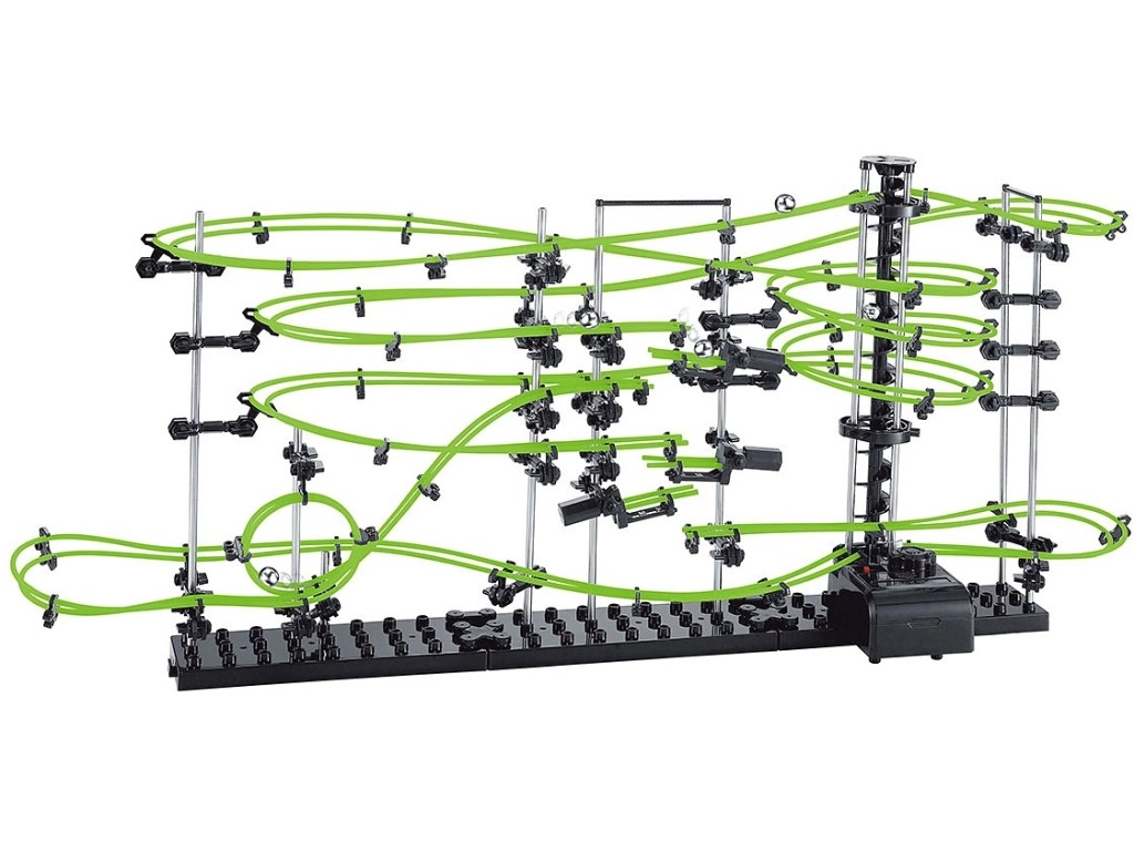 Deze lichtgevende knikkerbaan biedt een uitgebreide bouwset met 299 onderdelen, waarmee je eenvoudig unieke trajecten maakt volgens de handleiding of je eigen fantasie. Met een combinatie van hoogteverschillen, bochten en steile afdalingen test je de grenzen van de natuurwetten en geniet je van een meeslepend schouwspel dat in het donker oplicht.