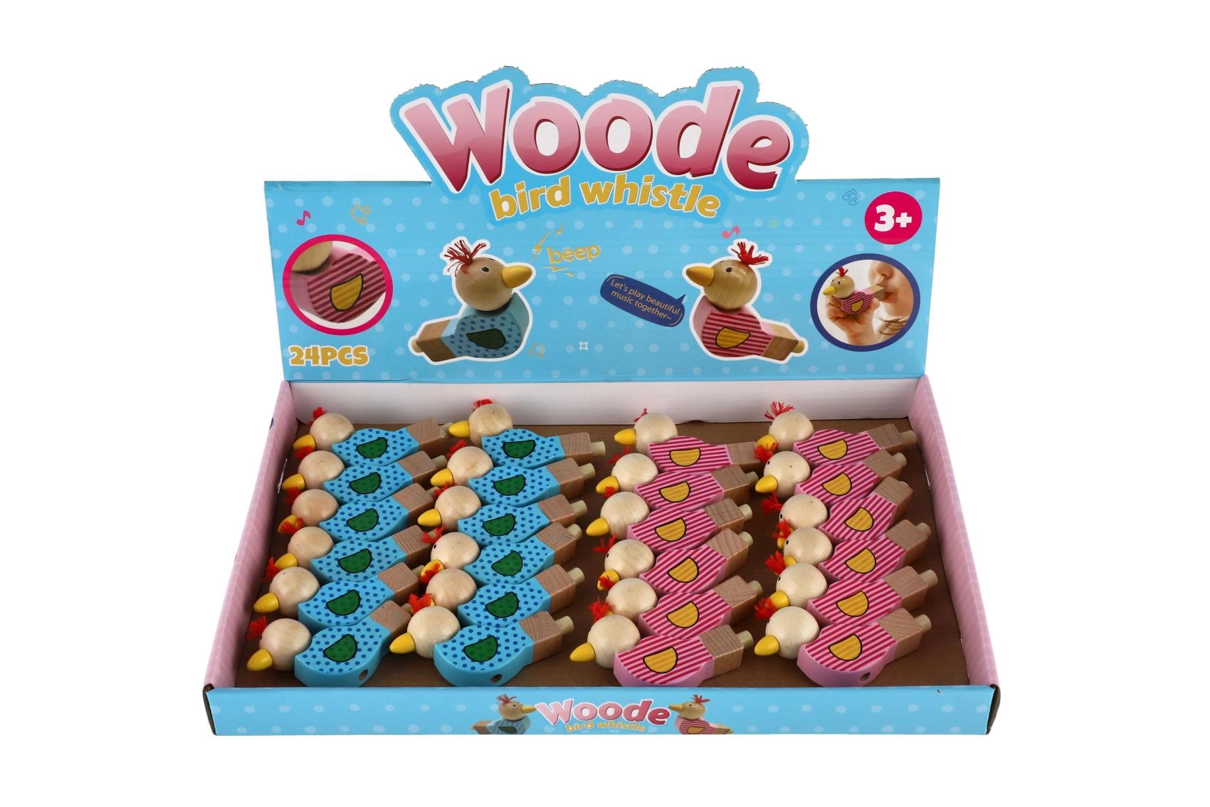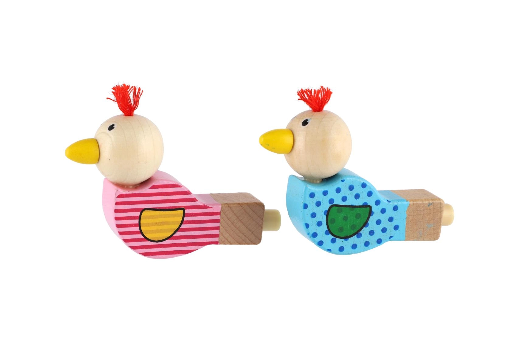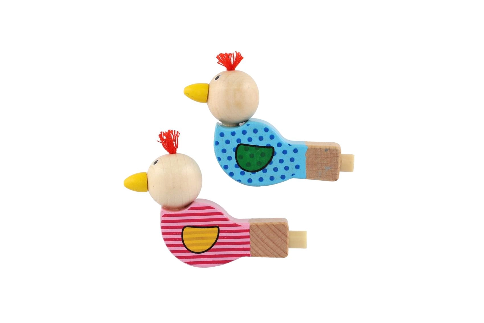 Het fluitje is gemaakt van hoogwaardig hout en versierd met vrolijke motieven in een roze en blauwe variant. Het kleine kwastje op het hoofd van het vogeltje geeft het speelgoed een eigen karakter. Geschikt als klein cadeautje, beloning of toevoeging aan een goodiebag voor kinderfeestjes.