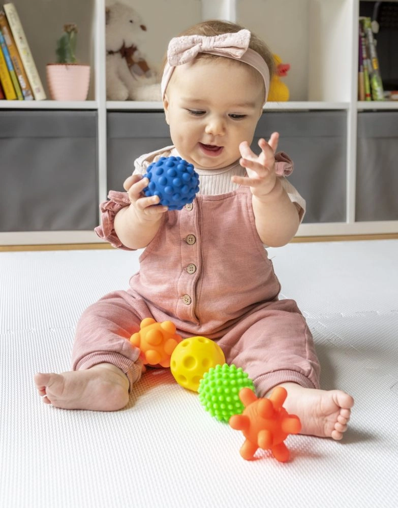 Elke bal heeft een ander oppervlak met uitstulpingen of kuiltjes die de tastzin stimuleren, het grijpen ondersteunen en de fijne motoriek ontwikkelen.
