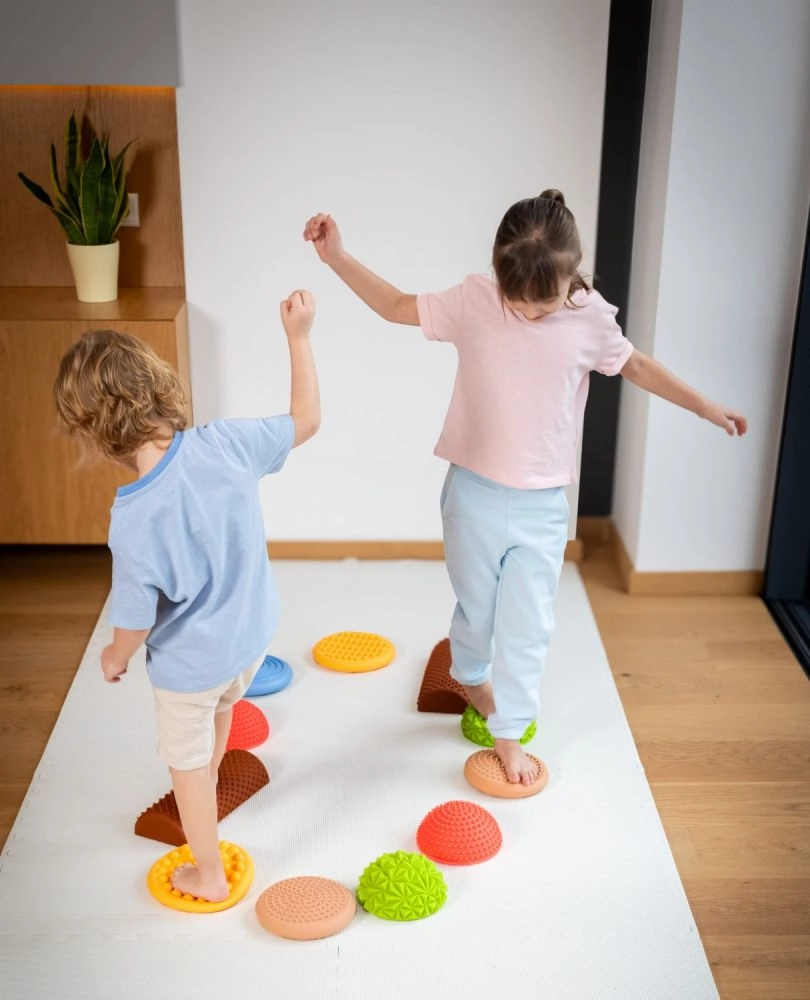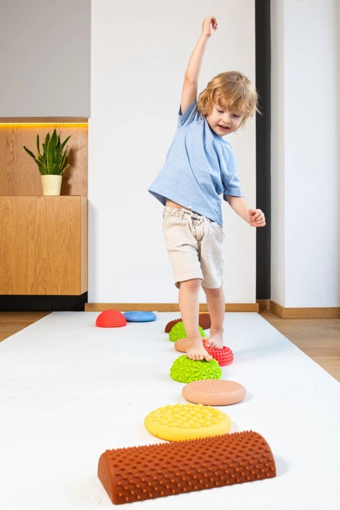 Het sensorische evenwichtsparcours in zachte pasteltinten is ideaal voor kinderen en volwassenen bij het ontwikkelen van balans, stabiliteit en ruimtelijk inzicht. De diverse oppervlakken – van fijne noppen tot meer uitgesproken massagepunten – bieden rijke tactiele stimulatie van de voetzolen en bevorderen een juiste lichaamshouding.