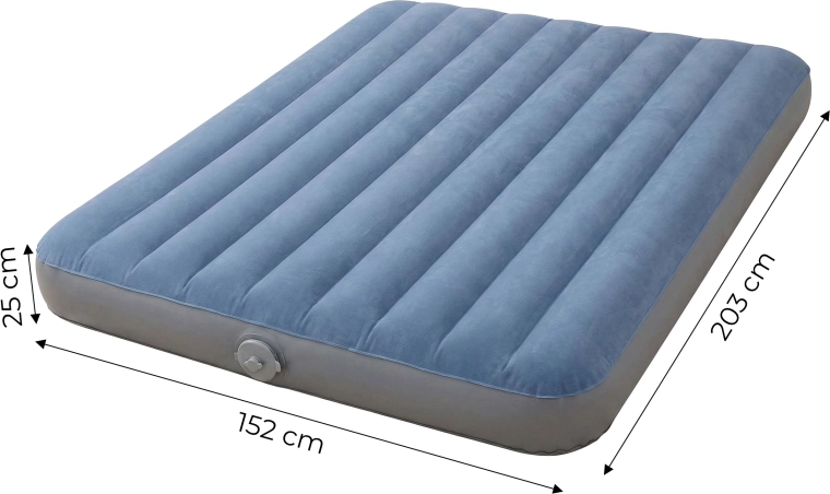 Inclusief ingebouwde oplaadbare pomp met lithiumbatterij voor comfortabel opblazen en leeglaten zonder extra accessoires – ideaal voor onderweg en thuis. Het aangename velours oppervlak is antislip en zacht aanraakbaar, terwijl de afmetingen 203 × 152 × 25 cm voldoende ruimte bieden voor twee volwassenen.