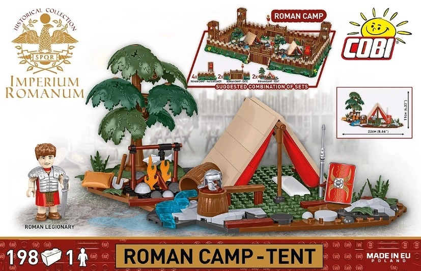 Bouw de contubernium-tent met terrein, vuurplaats, beekje, boom en tal van accessoires. Ideaal om mee te spelen en om historische scènes tentoon te stellen.
