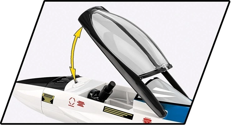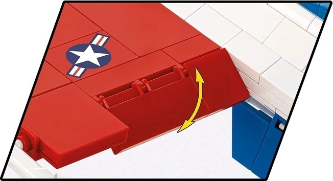 Bijgevoegd zijn een pilotenminifiguur in testpak met helm en slang van het zuurstofmasker, een te openen canopy, bewegende onderdelen van rolroeren en wielen, en een robuuste standaard met naam en schaal. Alle elementen hebben duurzame prints zonder stickers en zijn compatibel met andere bouw merken.