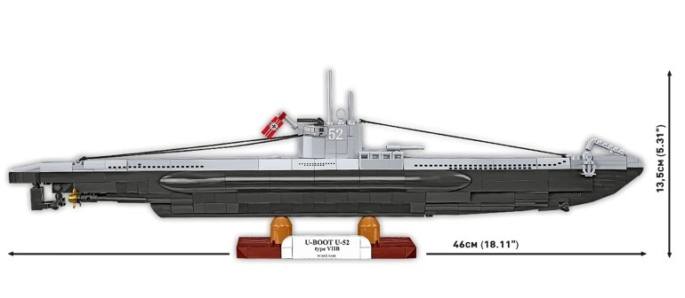 De U-BOAT U-52 type VIIB op schaal 1:144 is een zorgvuldig uitgewerkte bouwset die de vormen en details van een van de bekendste Duitse onderzeeërs getrouw weergeeft. Het model van circa 46 cm lang onderscheidt zich door realistische elementen zoals periscopen, een mast met tuiglijnen, schroeven en dekdetails. Na het bouwen wordt het een indrukwekkend displaystuk op de meegeleverde voet met modelnaam en schaal.
