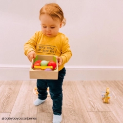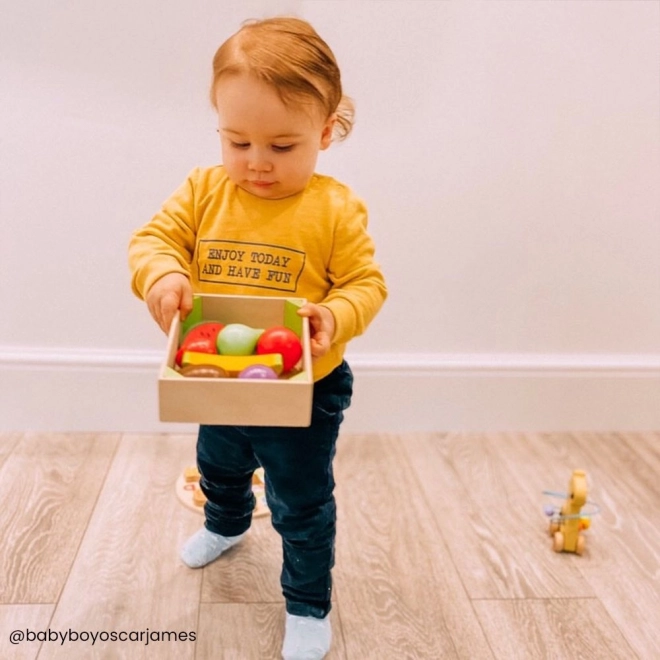 Na het spelen kan het fruit gemakkelijk worden opgeborgen in de doos, die wordt beschermd door een schuifdeksel. Dit houten speelgoed is gemaakt van hoogwaardige en verantwoord geproduceerde materialen die voldoen aan de huidige Europese veiligheidsnormen.