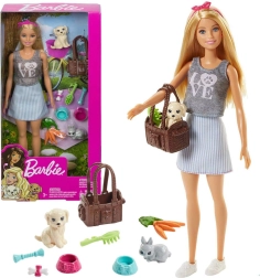 Ontdek de magie van de zorg voor huisdieren met de pop BARBIE en schattige dieren. De stijlvolle pop met lang blond haar, gestreept rokje en een grijze top met print komt met een hondje, een konijntje en 6 accessoires om te spelen met voeren, borstelen en vervoeren in een praktische tas. Een geweldige keuze voor creatief spel voor kinderen vanaf 3 jaar.