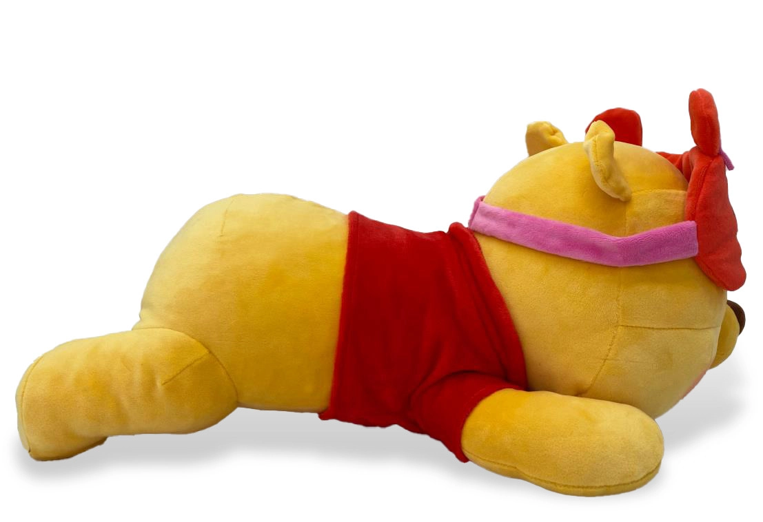 Een schattige pluchen teddybeer WINNIE THE POOH in liggende houding, ideaal om mee te knuffelen, te ontspannen en in slaap te vallen. Gemaakt van uitzonderlijk zacht materiaal, uitgerust met een comfortabel oogmasker en een aangenaam verzwarend effect in de pootjes voor rust en een veilig gevoel. Lengte ca. 40 cm, een geweldige metgezel voor kinderen van alle leeftijden.