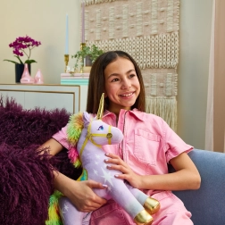 Ontdek de magische wereld van UNICORN ACADEMY met de pluchen eenhoorn WILDSTAR. Deze superzachte knuffel van 35 cm hoog heeft lichteffecten in de hoorn en op het lichaam en begeleidend geluid. Dankzij de zachte lila pluche, de regenboogmanen en staart en de gouden details is hij ideaal om mee te knuffelen en voor creatief spel.