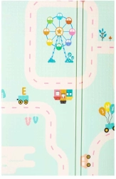 Schattige panda’s aan de ene kant en een wegenmotief aan de andere stimuleren verbeelding, leren en plezier met autootjes en bouwstenen.