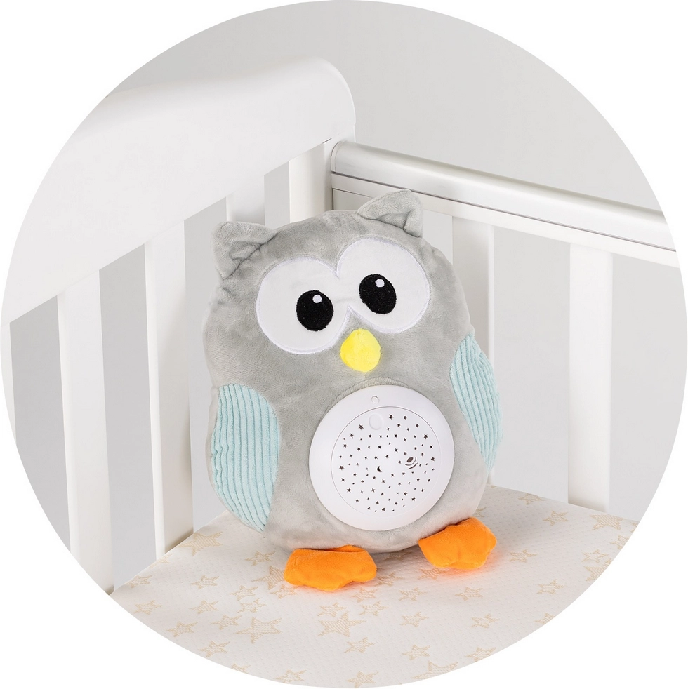 Dankzij de uitneembare muziekdoos kunt u het pluche deel eenvoudig met de hand wassen tot 30 °C. Werkt op 3× AAA-batterijen (niet inbegrepen), zodat u de uil overal mee naartoe kunt nemen – in het ledikantje, de kinderwagen en op reis.