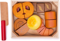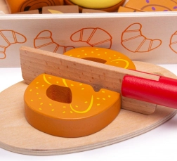 Elk stuk gebak is verbonden met klittenband en kan met een houten mes worden gesneden voor realistisch spel.