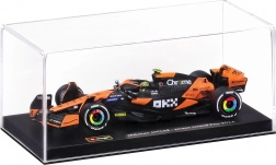 Het model is geplaatst in een transparante vitrine op een sokkel, die beschermt tegen stof en tegelijk een aantrekkelijke presentatie mogelijk maakt. Rubberen slicks, realistische vleugels en nauwkeurige bedrukking benadrukken de verzamelwaarde. Een perfecte aanvulling op collecties van teams en speciale edities uit het raceseizoen 2024.