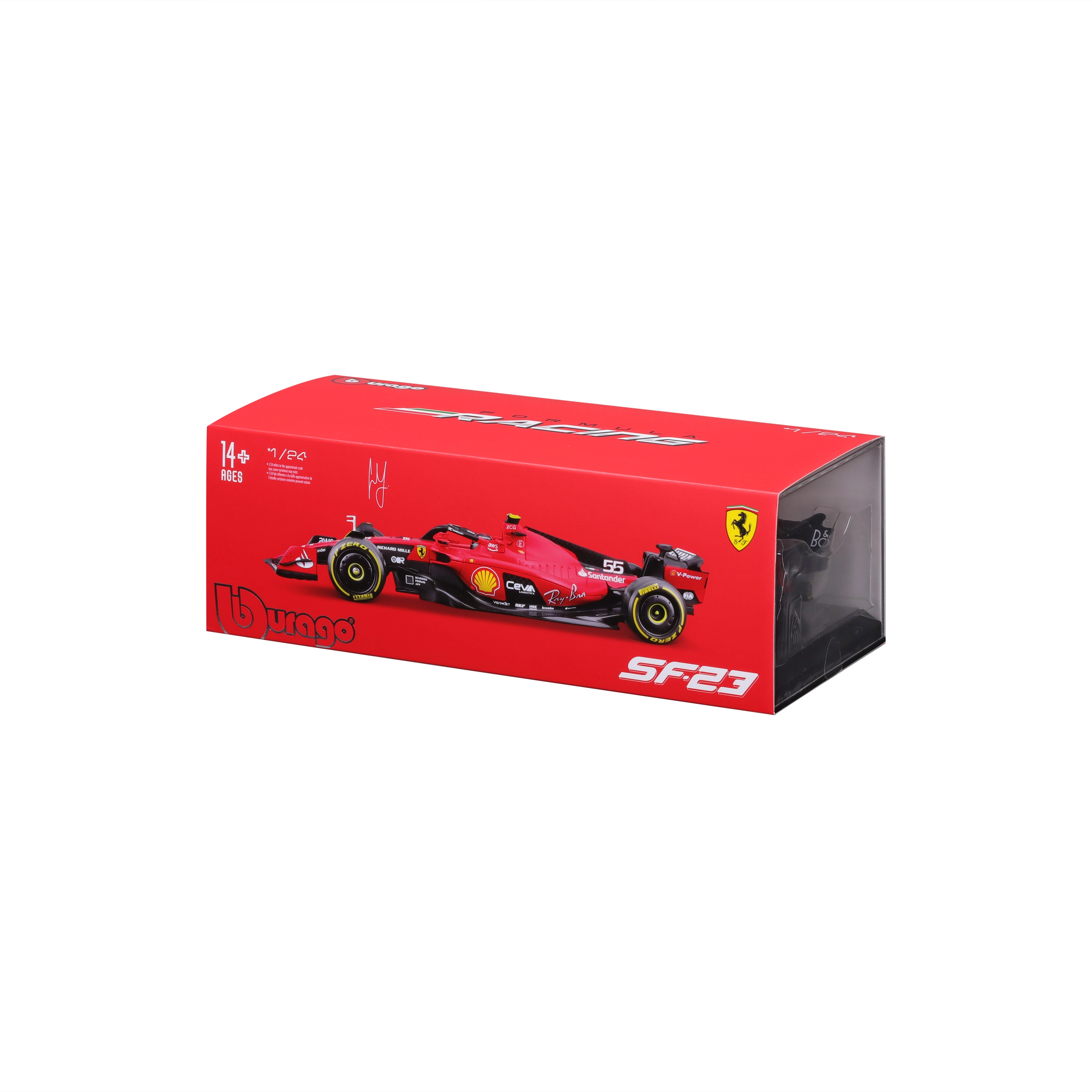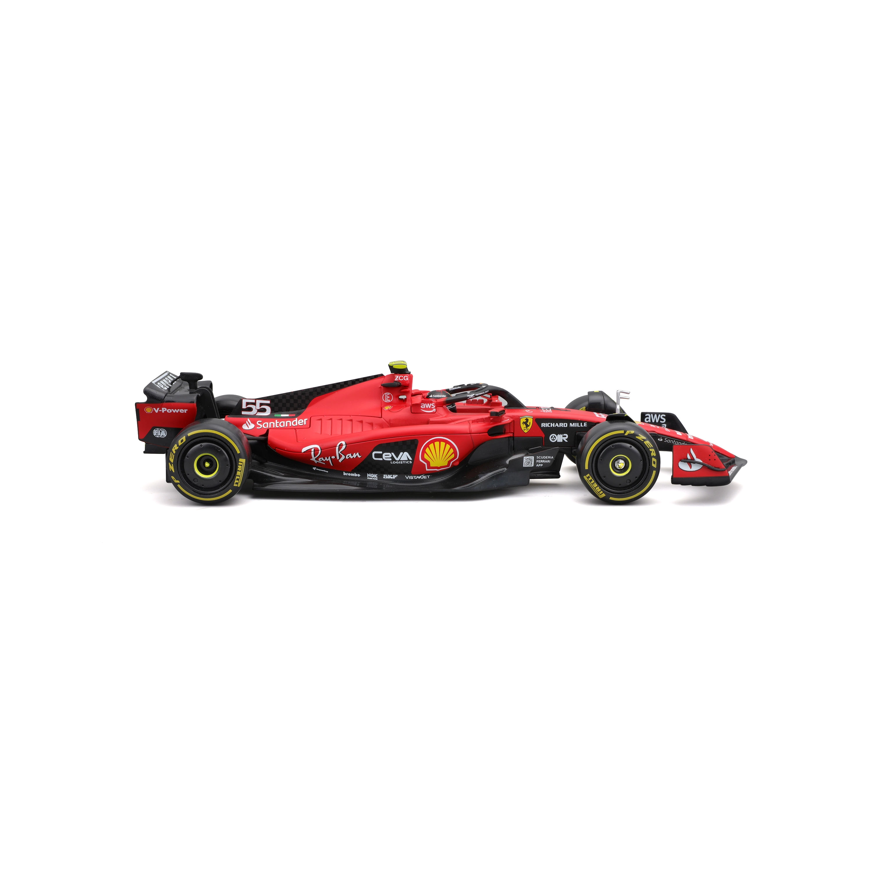 Precisie-aerodynamische elementen, halo, vleugels en realistische slickbanden met gedetailleerde bedrukking komen overeen met de echte FERRARI SF23.