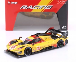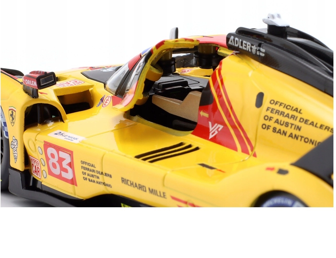 Dit verzamelmodel Bburago Ferrari 499P LMH op schaal 1:24 weerspiegelt getrouw de vormen en het racekarakter van de Hypercar-klasse. De gele kleurstelling en de 24h Le Mans 2024-stickers met startnummer 83 geven het model een authentieke look die zowel in de vitrinekast als op het bureau opvalt.