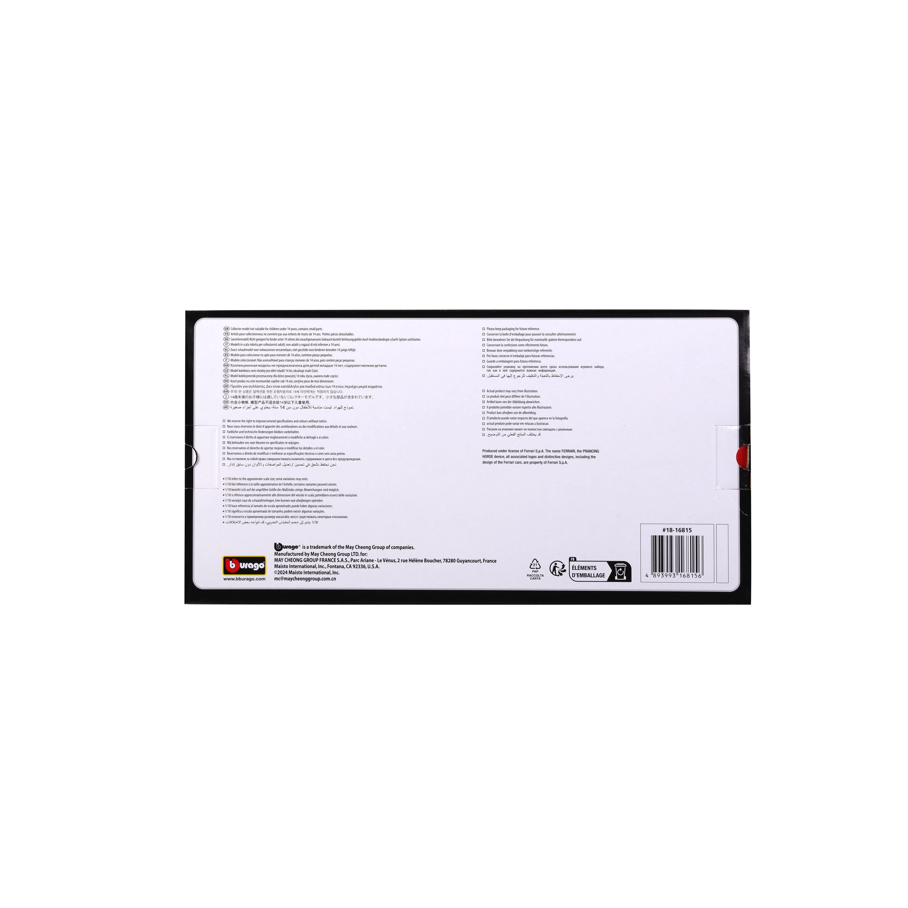 De carrosserie is van metaal (die-cast) met fijne kunststofdetails voor een nauwkeurige uitwerking van de voor- en achtervleugel, de diffuser en de ophanging. Realistische slickbanden, stuur en cockpitinterieur geven het model een topuitstraling. De decoratieve doos met venster maakt veilig opbergen of stijlvol schenken mogelijk.