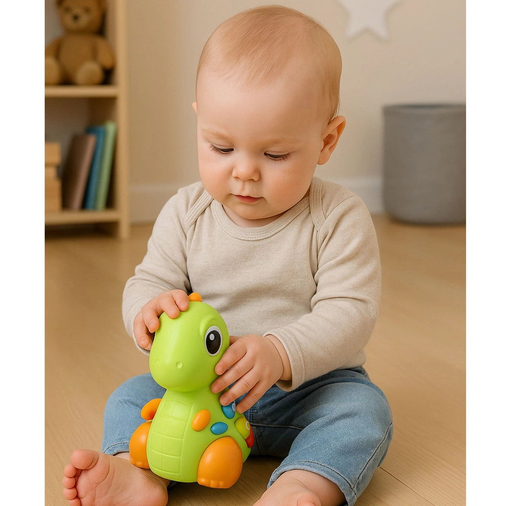 De interactieve dinosaurus trekt kinderen meteen aan: na het indrukken van de gekleurde knoppen gaat hij branden, speelt melodietjes af en maakt vrolijke geluiden. Een zacht tikje tegen de neus start muziek en beweging, wat helpt het verband te begrijpen tussen aanraking en reactie van het speelgoed – een geweldige basis voor leren door spel.
