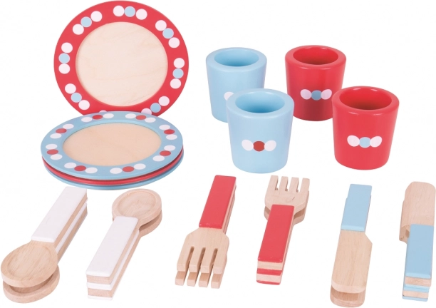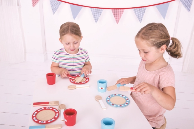 Laat jonge koks hun eigen diners en theekransjes voorbereiden met deze kleurrijke houten dinerset. Bevat 4 houten borden, bekers, messen, vorken en lepels, waardoor het een geweldige aanvulling op een houten speelkeuken is. Stimuleert creativiteit en verbeeldingskracht.