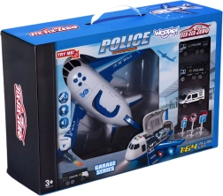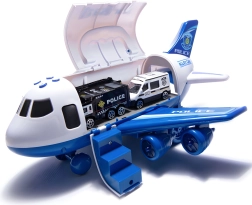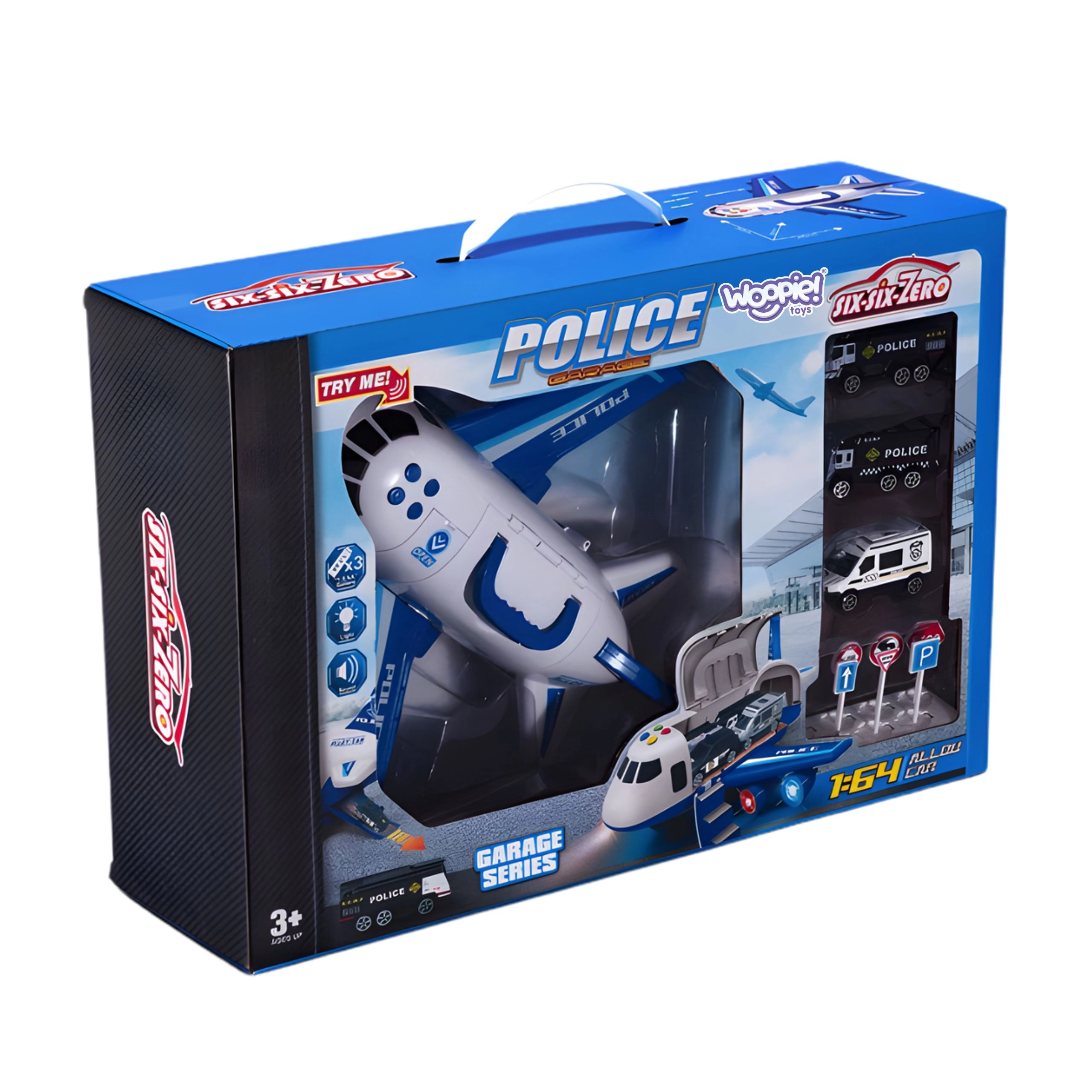 Ontdek het grote politievliegtuig–transporter van WOOPIE, dat de kinderfantasie meeneemt op een actievolle missie! In de ruime romp passen 3 politieauto's en een set borden. Met licht- en geluidseffecten met sirenes, een openende romp en neerklapbare laadklep en een praktisch handvat voor eenvoudig dragen.