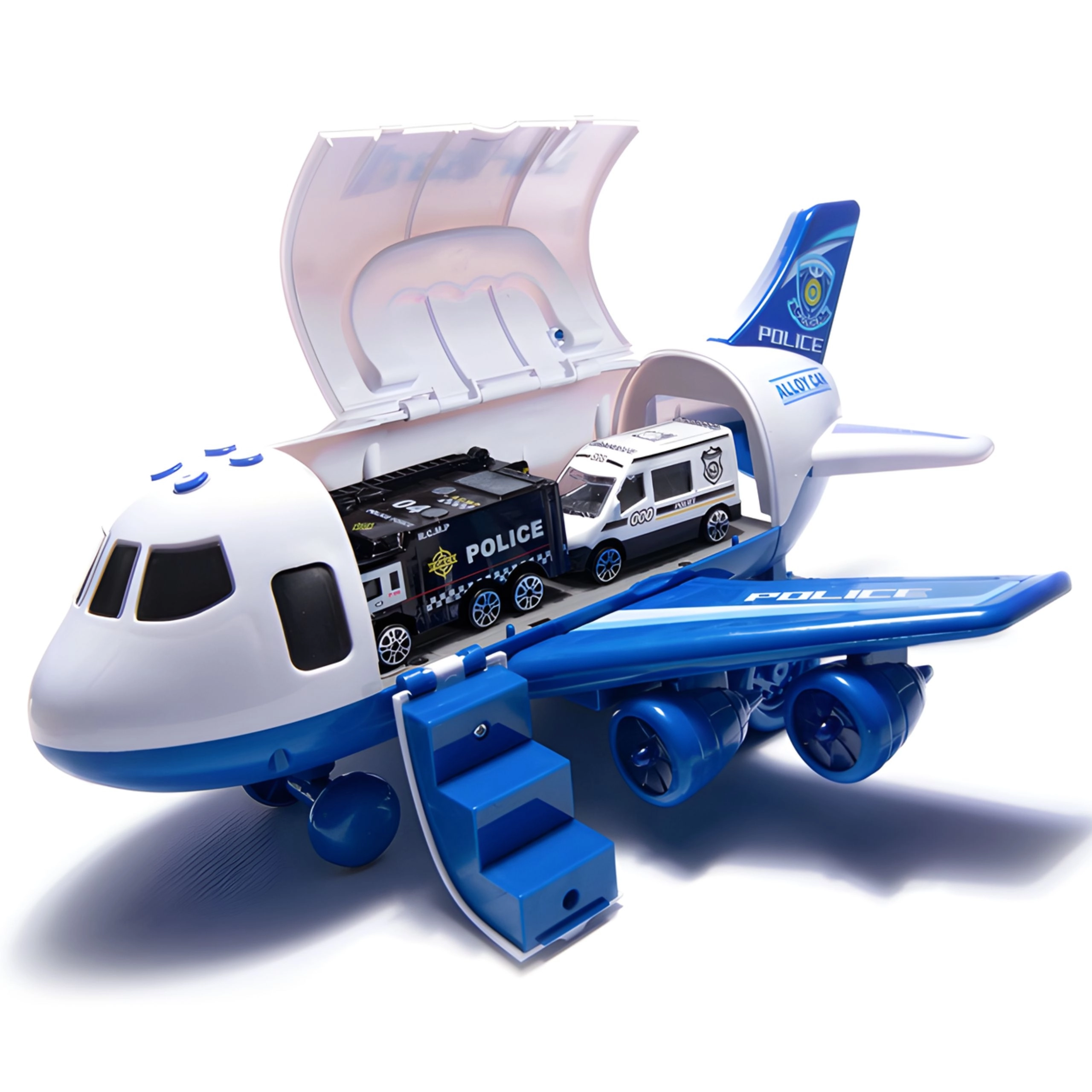 Het politievliegtuig–transporter van WOOPIE is het ideale speelgoed voor kleine ordehandhavers vanaf 3 jaar. Het biedt dynamisch spel met het laden van auto's in de romp, knipperende LED's en realistische sirenes via vier knoppen. Dankzij de neerklapbare laadklep laden kinderen de voertuigen eenvoudig in en vertrekken ze op reddingsactie.