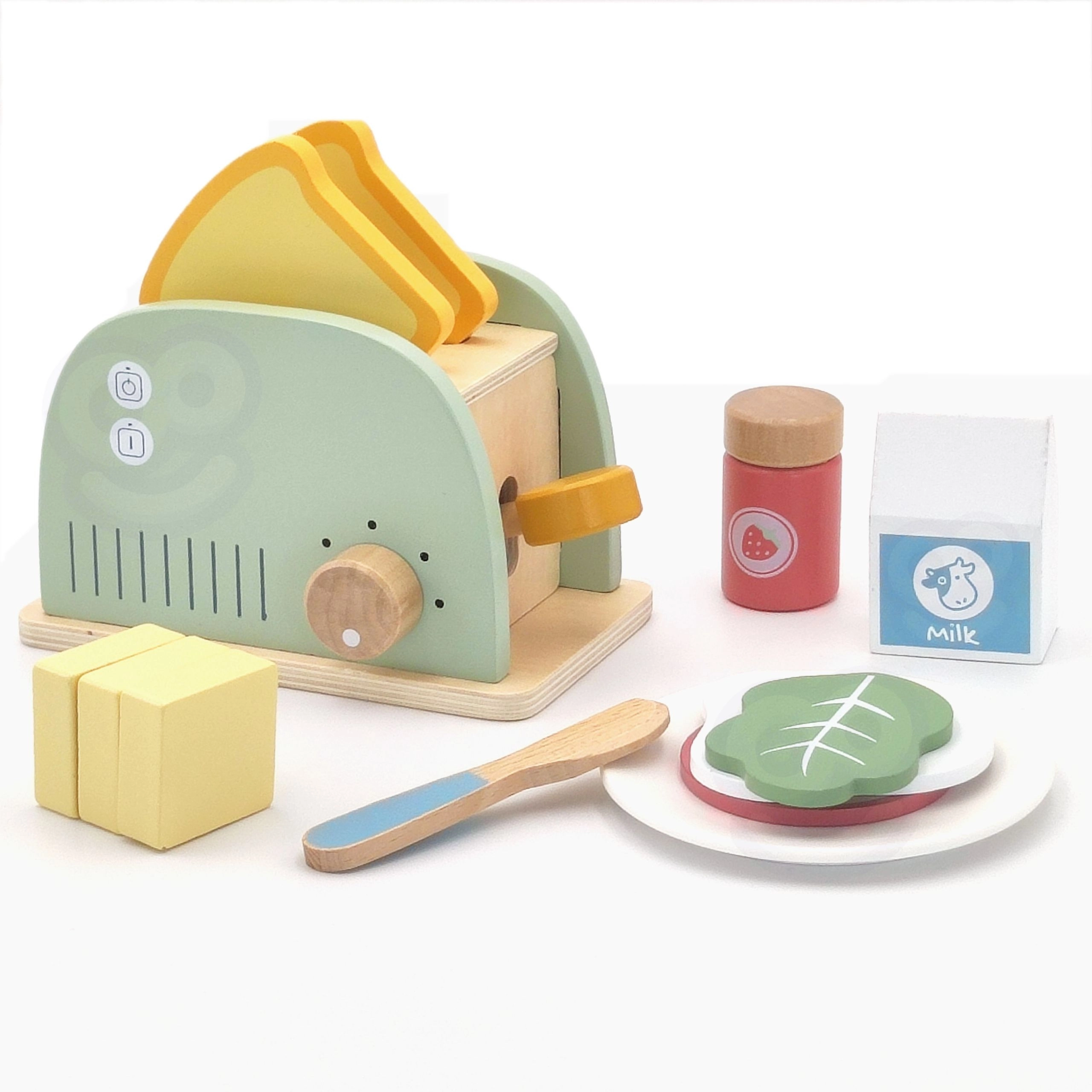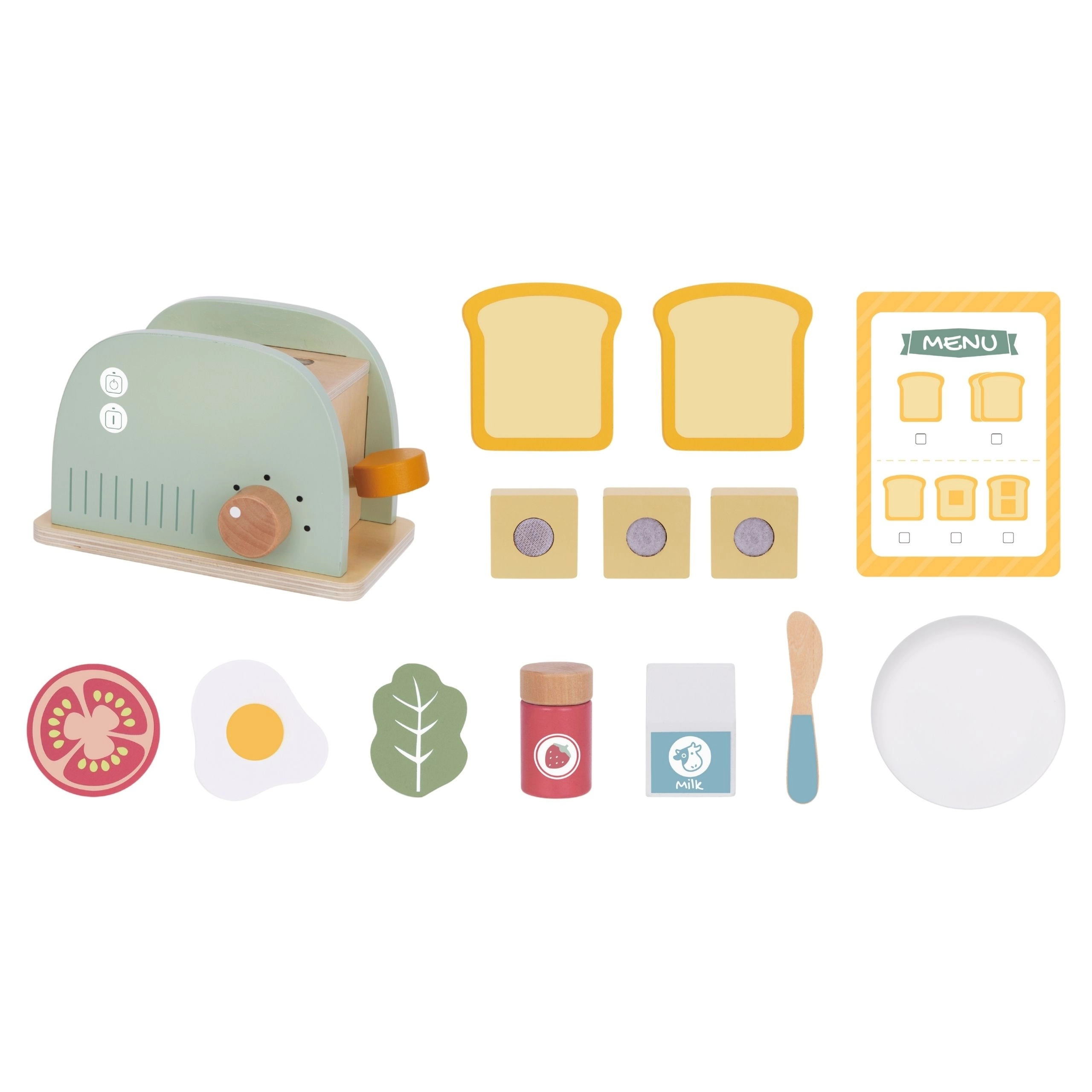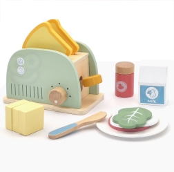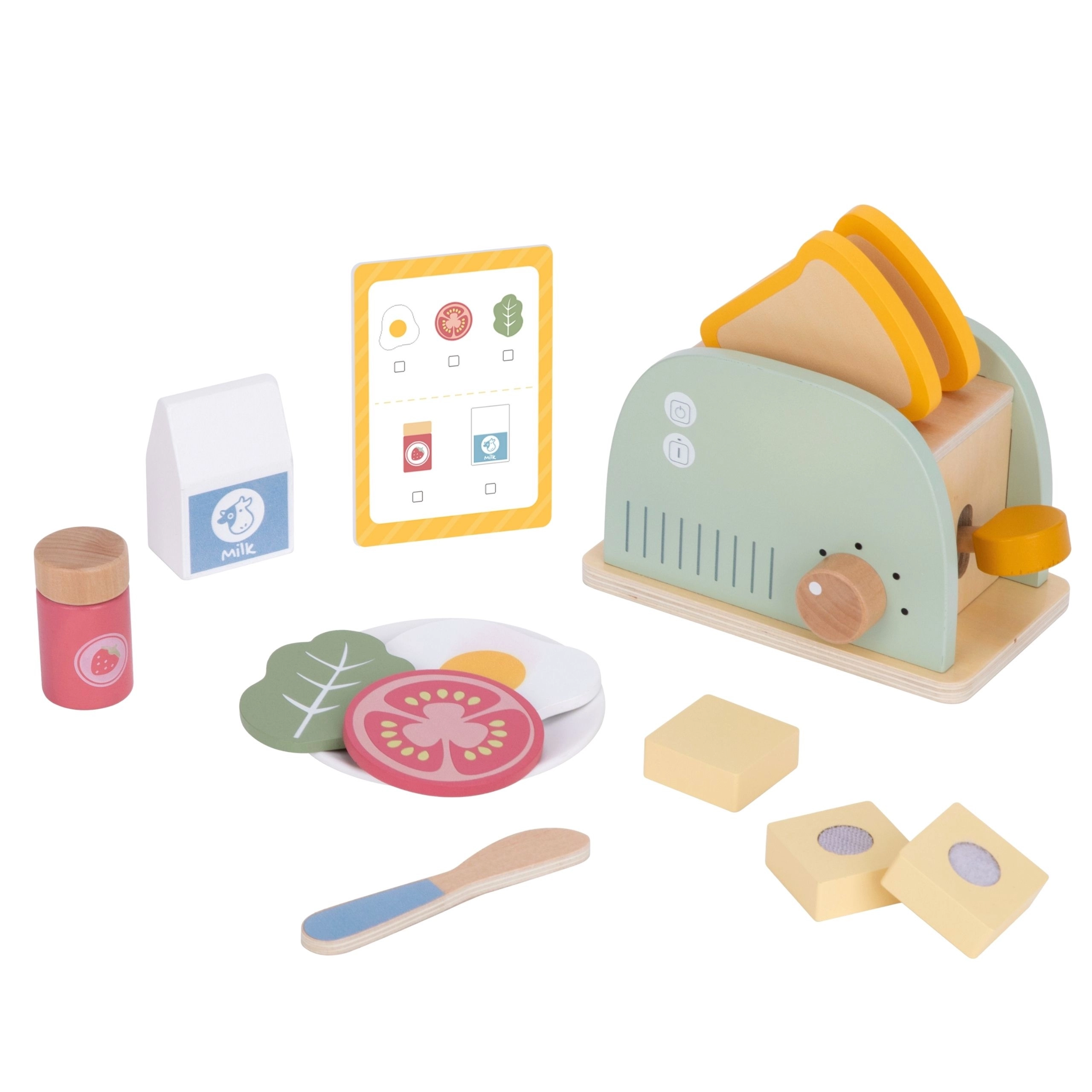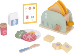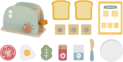 Stijlvolle houten ontbijtset met broodrooster voor kinderen vanaf 3 jaar die de verbeelding, fijne motoriek en rollenspel stimuleert. Bevat een broodrooster met hendel en draaiknop, twee sneetjes toast, ei, boter met mesje, melk, groente en kaas en zelfs een menukaart. Hoogwaardig, glad afgewerkt hout met niet-giftige pastelkleuren zorgt voor veilig en duurzaam speelplezier.