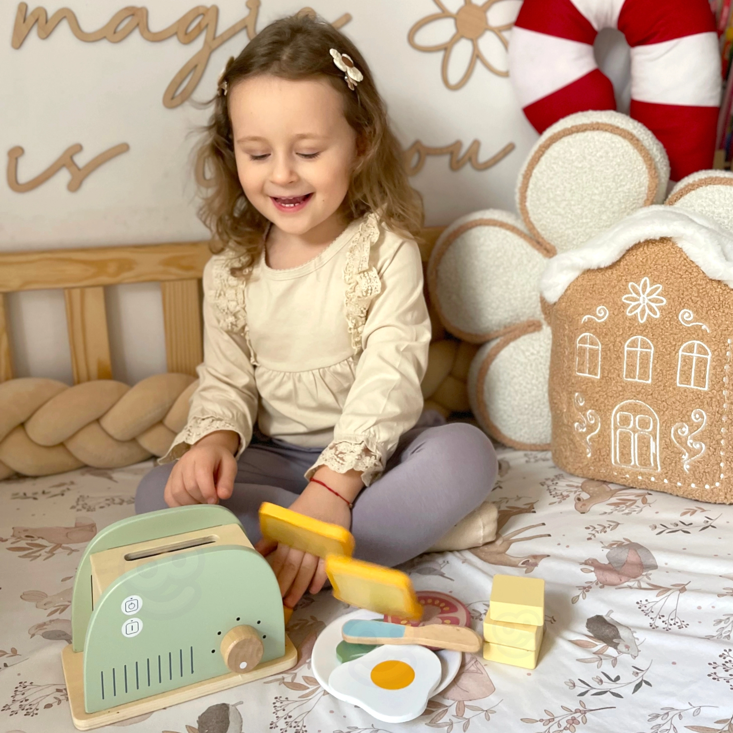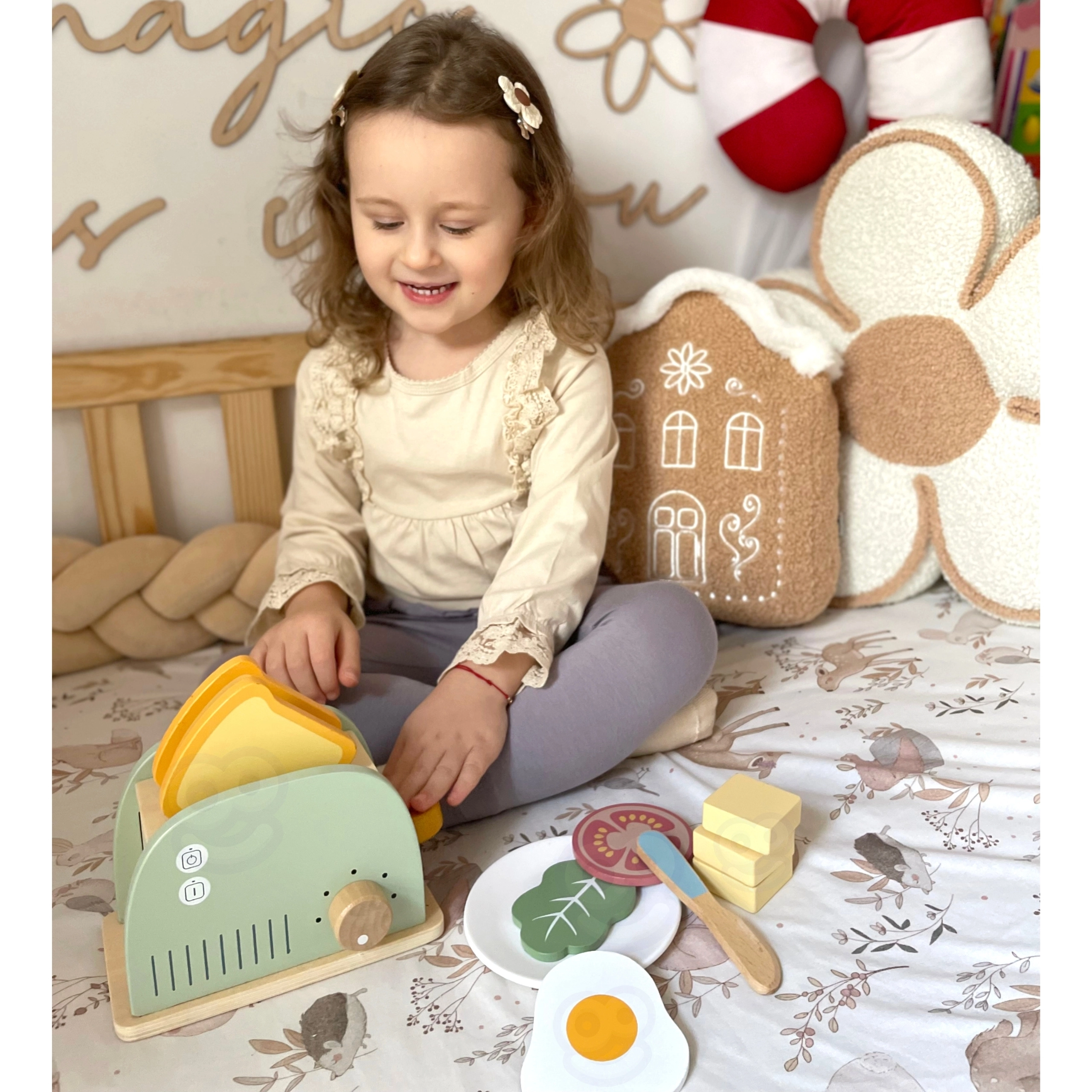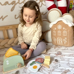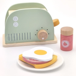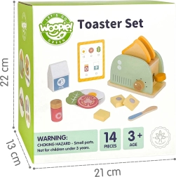Geef kinderen een heerlijk geurende ontbijtroutine – met de houten broodrooster WOOPIE GREEN bereiden ze smakelijke toast, een eitje en een sandwich met accessoires. Realistische functionele elementen (hendel om de toast te laten uitspringen en draaiknop) maken het spelen tot een echte keukenervaring die zelfstandigheid en creativiteit ontwikkelt.