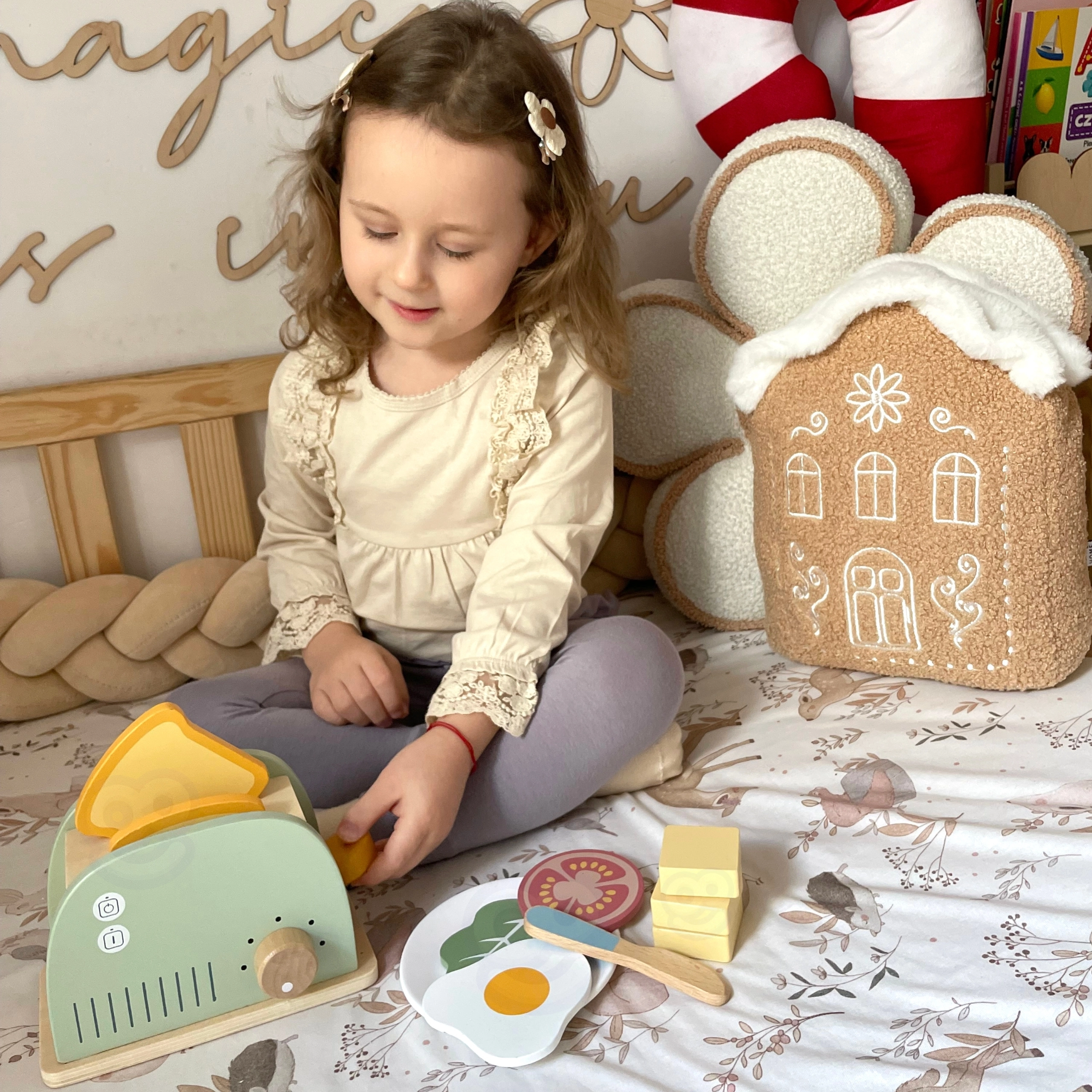 Kinderen kunnen de toast erin doen, aan de knop draaien en de hendel indrukken – de toast “springt” omhoog zoals bij een echt apparaat. Perfect als basis voor koksspelletjes.