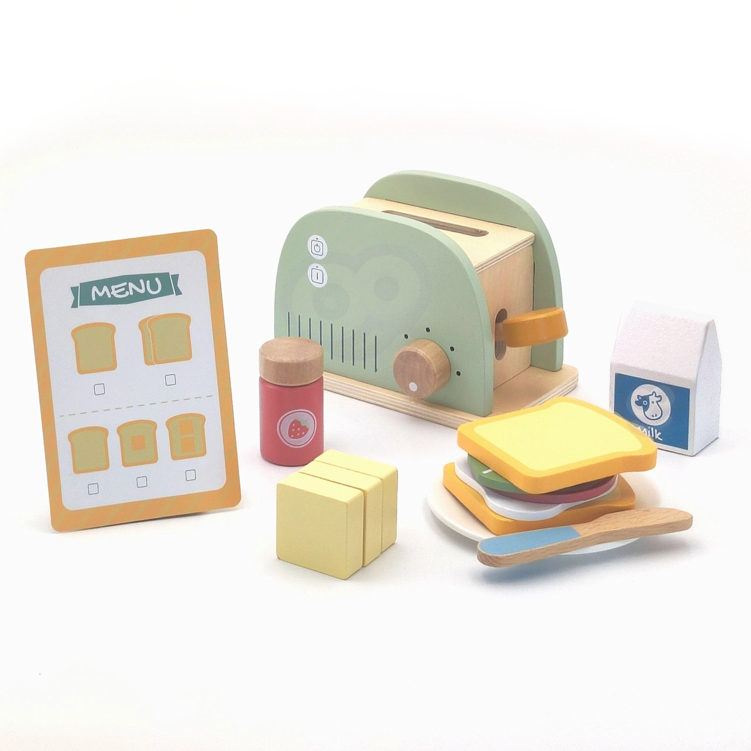 - broodrooster met hendel en knop, 2 sneetjes brood, ei, 3 blokjes boter, houten mesje, melkpak, plakje ham, plakje kaas, slablad, jam, bord, menukaart