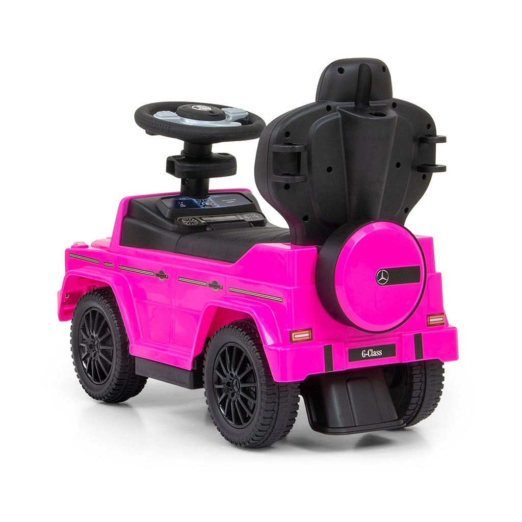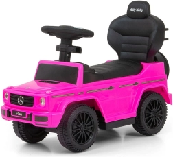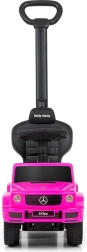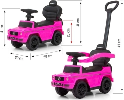De gelicentieerde MERCEDES G350d loopfiets in het roze ziet eruit als een echte terreinwagen en motiveert kinderen tot actief bewegen, traint balans en motoriek. Dankzij de hoge rugleuning, zij-armen en duwstang is hij geschikt voor kinderen die al kunnen zitten, maar ook voor kleine lopers. Na het verwijderen van de duwstang, armleuningen en voetsteunen verandert hij in een klassieke loopfiets.