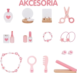 De set bevat rijke houten accessoires voor realistisch spel: kam, schaar, föhn, handspiegel, poederdoos met spiegeltje, oogschaduw, lippenstift, nagellak, ook “parfums” en sieraden (ketting, armbanden, ringetjes), plus haarelastiekjes en haarversieringen. Spel stimuleert op natuurlijke wijze de fijne motoriek, creativiteit, coördinatie en het zelfvertrouwen.