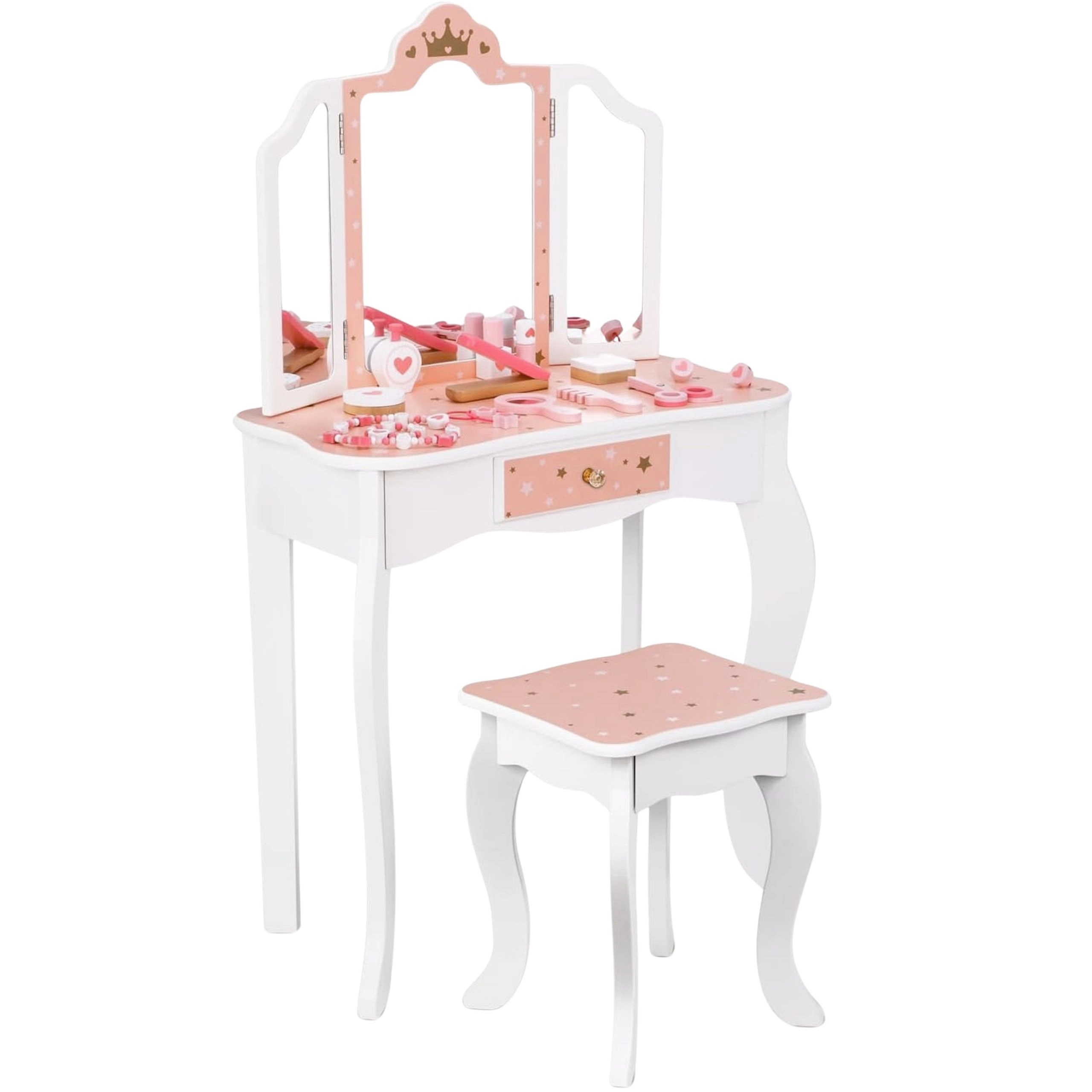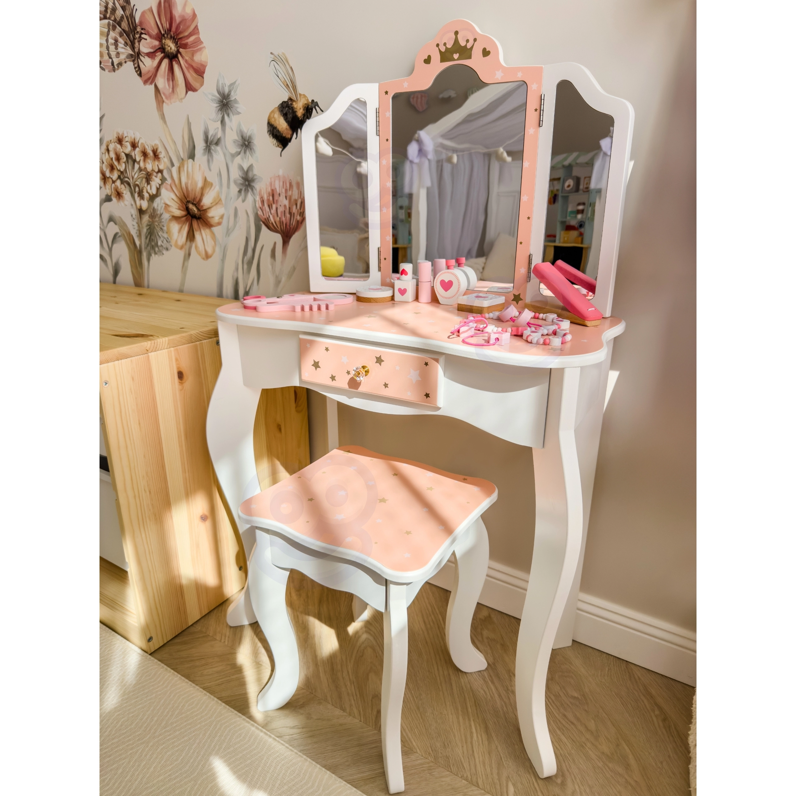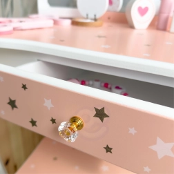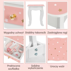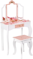 Geef kinderen hun eigen magische beautyhoekje. De houten kaptafel WOOPIE GREEN in zachte pastelkleuren roze en wit valt op door het elegante design met een driedelige spiegel met beweegbare vleugels, een ruim blad en een praktische lade voor schatten. Inclusief comfortabel krukje op kinderhoogte.