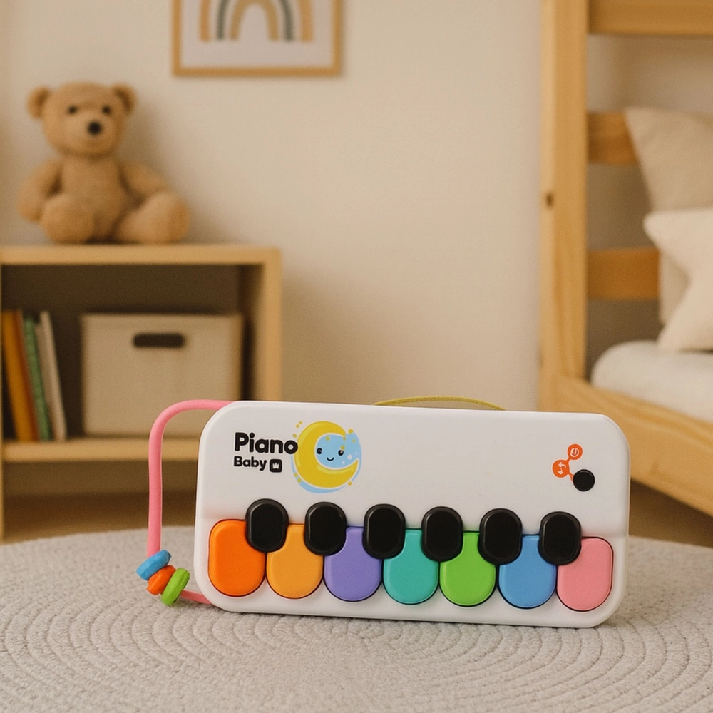 Een kleurrijke interactieve piano voor de kleintjes die gehoor, ritme en verbeelding ontwikkelt. Dankzij 8 vrolijk gekleurde toetsen, plezierige geluidseffecten en een licht, draagbaar design met een goed vast te houden lus is hij ideaal voor thuis, de opvang en onderweg. Gemaakt van veilige materialen, perfect voor kleine handjes.