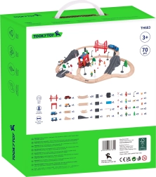 - 70 onderdelen voor veelzijdig spel: rails, brug, tunnels, verkeersborden, verkeerslichten, figuren, dieren, brandweerkazerne, brandweerauto, ambulance, trein en wagon.