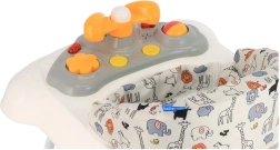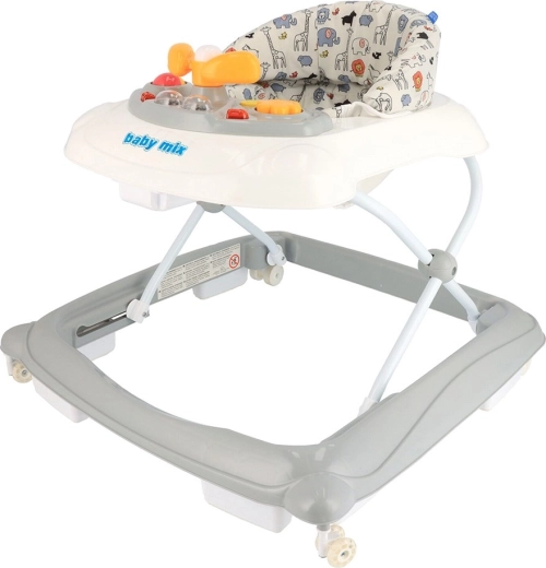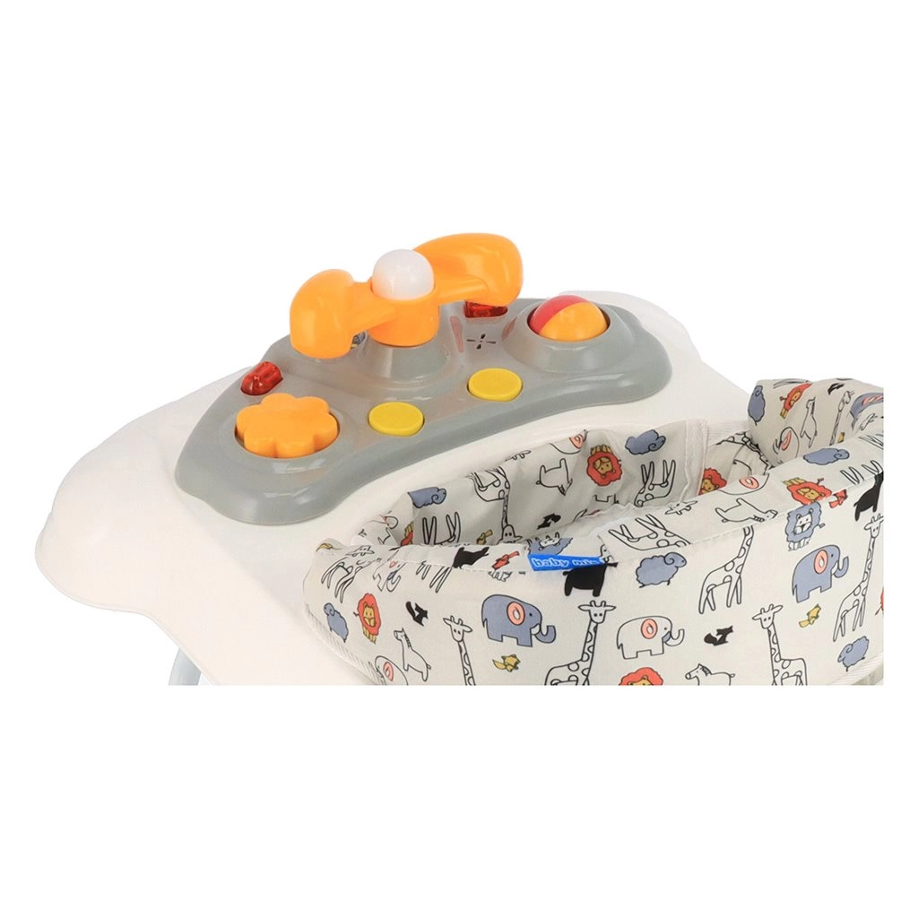 De praktische babyloopwagen BABY MIX met stabiele constructie en een multimediapaneel ondersteunt de eerste stapjes van je baby op een leuke en veilige manier. Biedt een ergonomisch gevormde zitting voor een juiste rughouding, 3-traps hoogteverstelling en siliconen wieltjes die de vloer ontzien. Inclusief licht- en geluidseffecten, een draaibaar stuur met claxon en kantelbeveiliging.